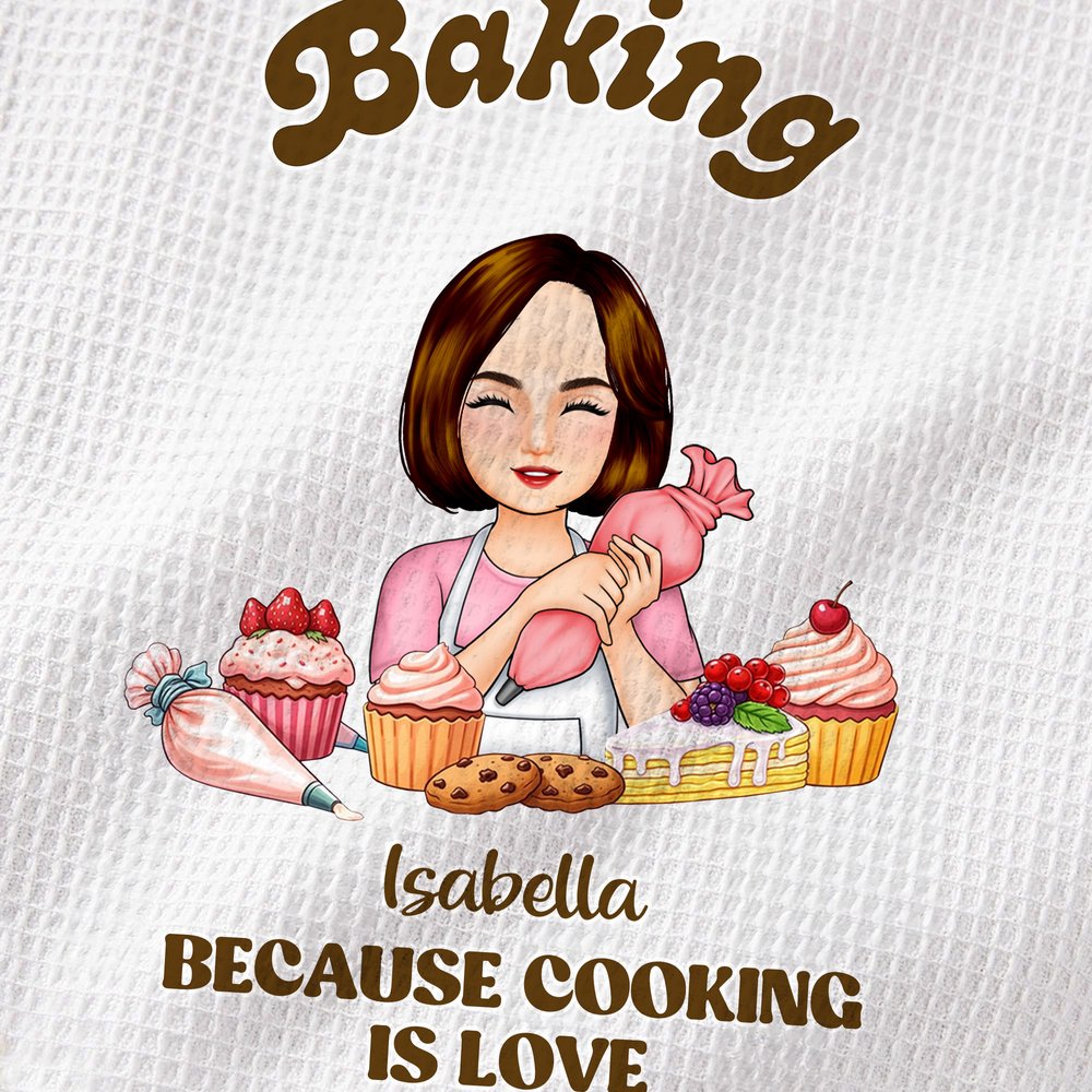 Questo giocoso asciugamano da cucina presenta un'affascinante illustrazione personalizzata di un panettiere, circondato da adorabili cupcake, biscotti e strumenti da forno, abbinati alla spassosa citazione "Baking Because Cooking Is Love". Completamente personalizzabile, è possibile aggiungere qualsiasi nome al disegno, trasformando un semplice oggetto da cucina in un pezzo unico e personalizzato che riflette la personalità e il senso dell'umorismo del panettiere.