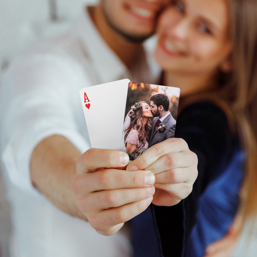 Tutte le 52 carte, eccetto i due Joker, possono essere personalizzate con foto sul fronte, così puoi conservare dolci ricordi con i tuoi cari, i viaggi in famiglia o momenti con gli amici. Se scegli 1 foto per il fronte, tutte le carte avranno la stessa immagine; scegliendo 4, ogni seme avrà la stessa foto; scegliendo 13, tutte le carte dello stesso valore avranno la stessa foto; scegliendo 52, ogni carta avrà una foto diversa. I due Joker sono disponibili in tre stili personalizzati. Anche il retro di ogni carta può essere personalizzato con una foto unica e con il tuo nome e la data.