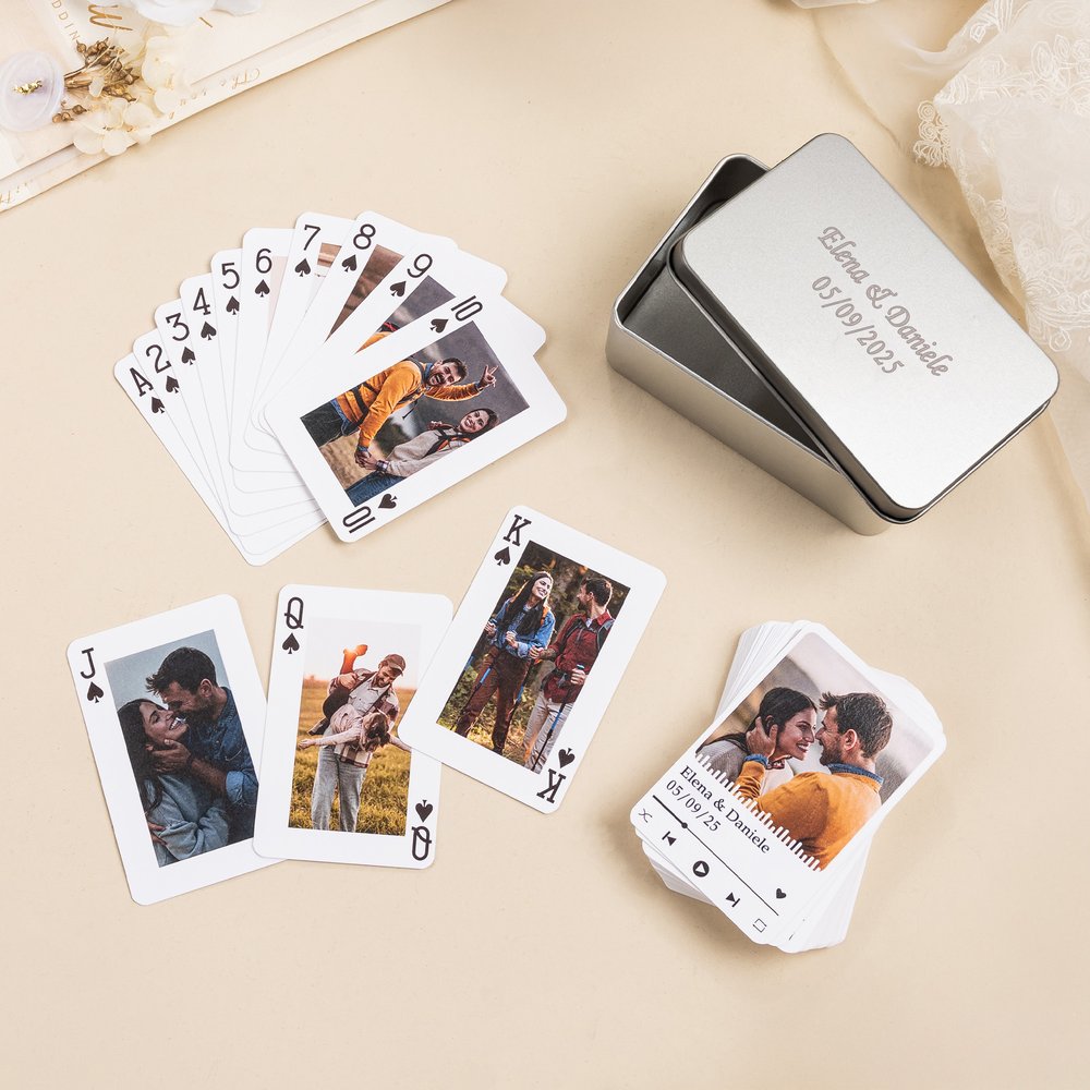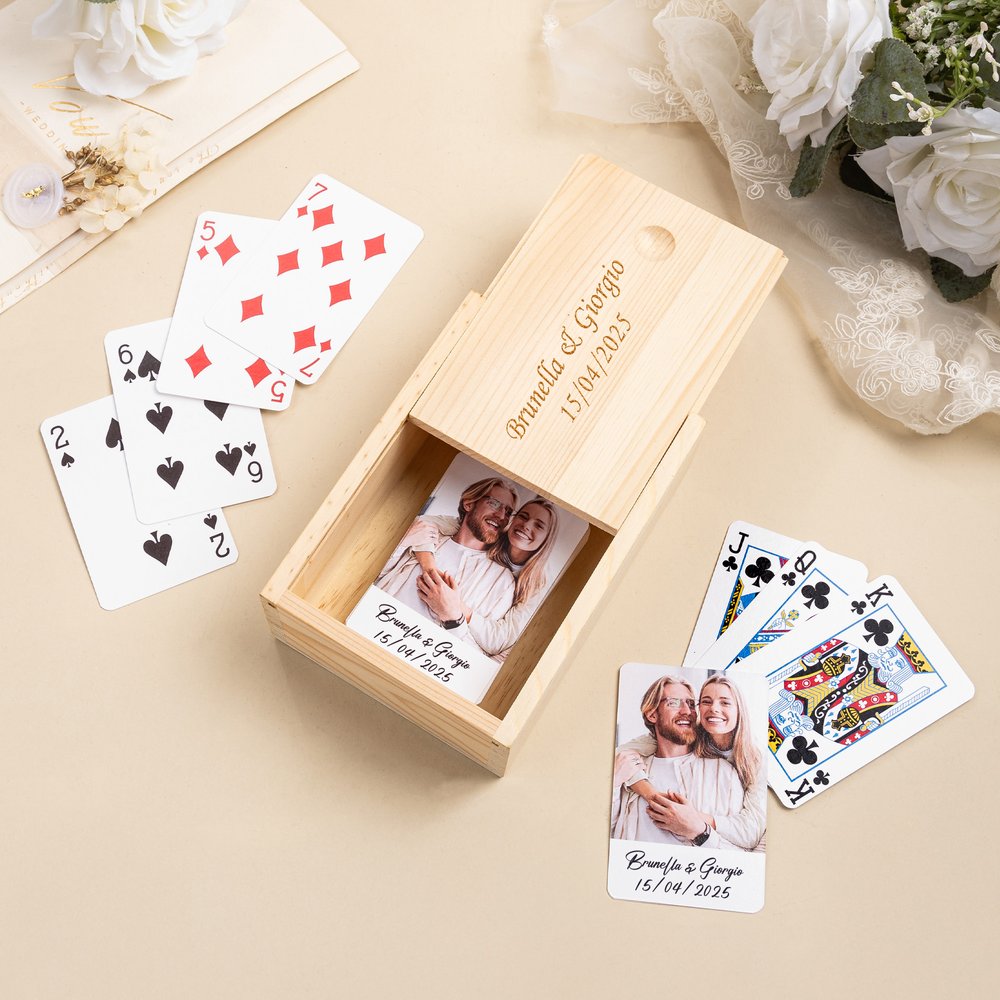 Questo mazzo non è solo un ricordo speciale, ma uno strumento di gioco vero e proprio. Puoi usarlo con tutti i tuoi giochi di carte preferiti. Durante riunioni di famiglia, momenti con amici, nei weekend o in viaggio, questo mazzo diventa subito protagonista e crea un’atmosfera unica. Puoi anche scegliere tra una scatola in legno o in metallo per conservarlo.